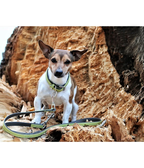 Das zweifarbige Hundehalsband Style Amsterdam ist nicht nur schön anzusehen! In Deutschland aus schmiegsamem Camargue Kalbleder gefertigt, umfasst es den Hals des Tiers, ohne zu reiben und zu scheuern. Ein weiches Unterband ist fest mit dem stabilen Oberband vernäht. Der D-Ring, der die Leine hält, ist in den Verschluss des Hundehalsbands Style Amsterdam eingenäht. Dadurch dreht sich der Verschluss des Bands nach hinten, wenn Ihr Hund an der Leine läuft, und kann auf keinen Fall in dessen Kehlkopf drücken. Der leicht abperlende Effekt der Halsbandoberfläche sorgt dafür, dass Nässe und Schmutz kaum einziehen. Sollte das Halsband eine Reinigung nötig haben, können Sie es einfach mit einem weichen Lappen feucht abwischen. Wenn Sie das Leder gelegentlich mit einem entsprechenden Pflegemittel behandeln, bleiben Farbe und Elastizität erhalten. Bestellen Sie das Hundehalsband Style Amsterdam von Das Lederband noch heute, damit Ihr Begleiter möglichst bald dieses bequeme Accessoire genießen kann.