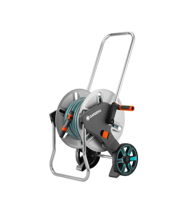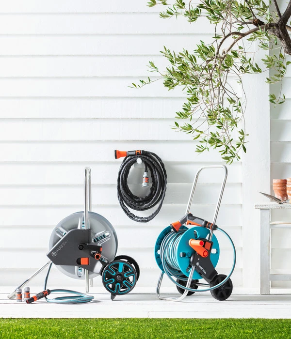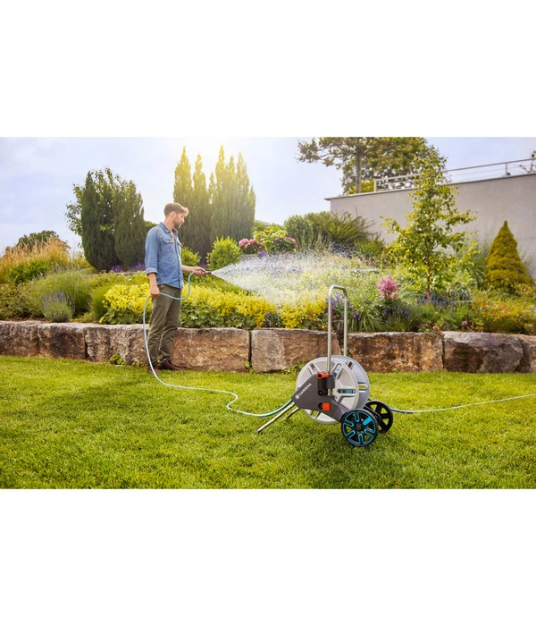 Platzsparende Aufbewahrung, komfortable Handhabung – das garantiert der GARDENA Metall-Schlauchwagen CleverRoll M Set