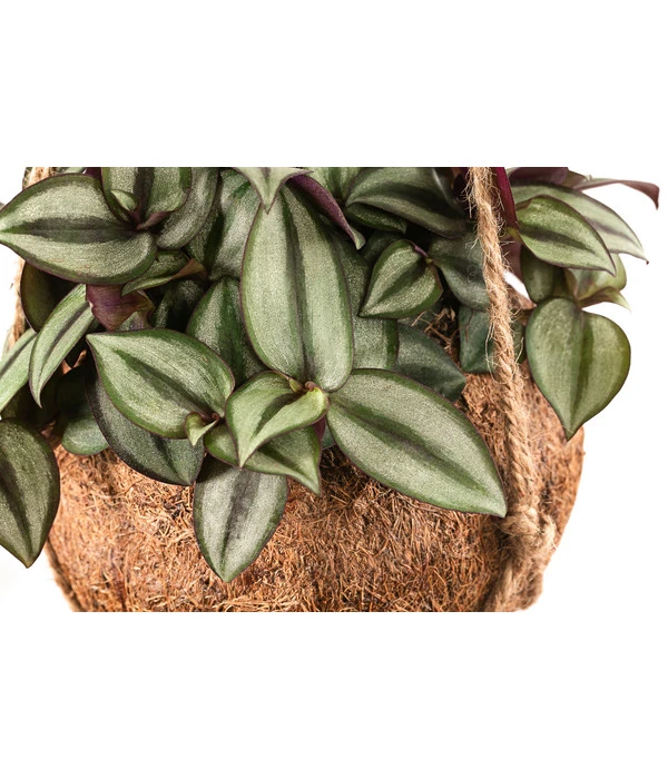 Sie zeigt rundliche, spitz zulaufende Blätter, die zudem ein markantes rot-grünes Streifenmuster tragen – kein Wunder, dass die aus den tropischen Regionen Amerikas stammende Pflanze eine der beliebtesten Zimmerpflanzen bei uns ist. Wie ihre Fans wissen, kommt die auch Zebrablume genannte Pflanze mit ihren hängenden Trieben besonders schön in einer Pflanzenampel zur Geltung, aus der sie ihre Triebe mit den dekorativen Blättern elegant fallen lassen kann. Mit der Kokodama-Ampel Dreimasterblume aber können wir Ihnen einen ganz besonderen Ampeltopf anbieten. Vielleicht haben Sie schon von dem aus Japan stammenden Trend Kokedama gehört, bei dem der Topf aus einer Mooskugel besteht und die Bezeichnung aus den Begriffen koke für Moos und dama für Kugel gebildet wurde? Bei der Kokodama-Ampel Dreimasterblume aber besteht der Topf nicht aus Moos, sondern wurde sorgfältig von Hand aus Kokosfasern gefertigt. Hängen Sie gleich die Kokodama-Ampel Dreimasterblume bei sich auf und genießen das schöne Gefühl, sich mit 100 % Natur zu umgeben, denn der Innentopf besteht aus wasserdichter Pappe.