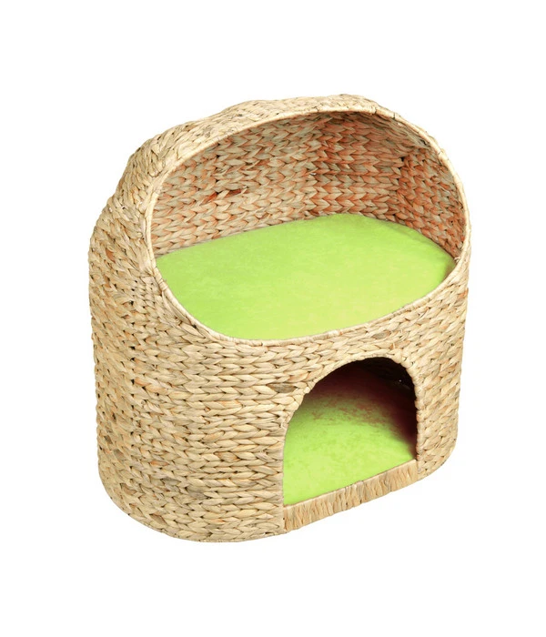 Diese Katzenhöhle Marvin von Silvio Design ist ein ganz besonderer Katzenkorb mit Höhle und Mulde in einem, der sich perfekt in Ihre Räumlichkeiten einfügt und als besonderer Rückzugsort für Ihren Vierbeiner dient. Die Katzenhöhle bietet ihrer Katze sowohl eine gemütliche Höhle zum Schlafen und Verstecken, als auch eine offene Liegemulde mit großzügiger Rückenlehne zum Entspannen und Beobachten. Die beiden Liegeflächen der Höhle und der Mulde bestehen aus massivem Holz, bei denen jeweils ein Kissen mitenthalten ist und Ihrer Katze ein gemütliches Plätzchen bereiten. Ein Metallrahmen gibt dem weichen Geflecht aus Wasserhyazinthe die nötige Stabilität. Die Katzenhöhle ist in verschiedenen Farben erhältlich. Die geräumige Katzenhöhle Marvin von Silvio Design findet durch ihre vorteilhafte Größe von 54x55x39 cm überall in Ihren Räumlichkeiten einen perfekten Platz.