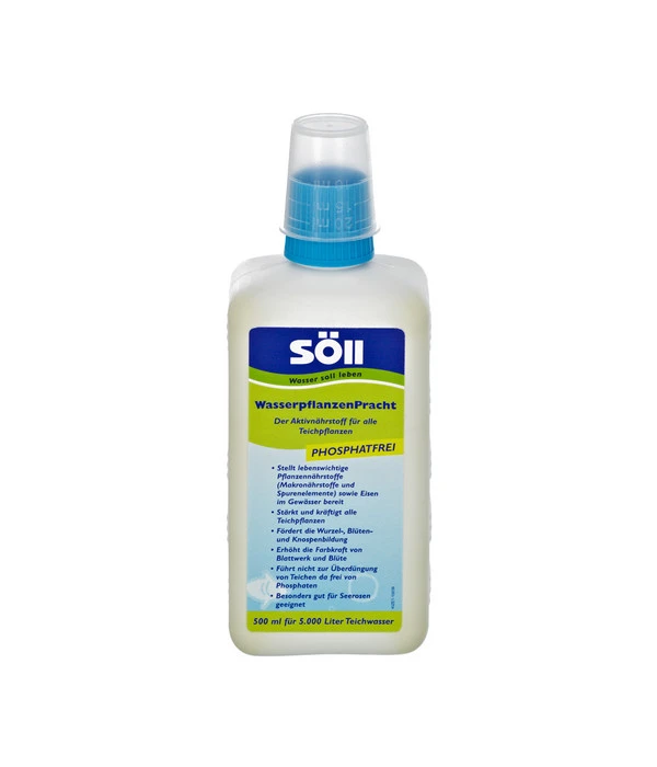 Vor allem die wunderschönen Wasserpflanzen machen einen Teich zu etwas einzigartigem. Mit dem Söll WasserpflanzenPracht unterstützen Sie nicht nur die Kräftigung und Stärkung der Pflanzen, sondern stellen diesen auch lebenswichtige Pflanzennährstoffe sowie Eisen bereit. Dank der speziellen Form können die Pflanzen das Eisen sofort aufnehmen wodurch ein optimaler Pflanzenwuchs unterstützt wird. Natürlich wurde das Nährstoffverhältnis von Söll WasserpflanzenPracht exakt auf die Bedürfnisse Ihrer Teichpflanzen abgestimmt. Söll WasserpflanzenPracht fördert außerdem die Wurzel-, Blüten und Knospenbildung und erhöht die Farbkraft von Blattwerk und Blüte. Besonders Seerosen profitieren von Söll Wasserpflanzen Pracht. Da Söll WasserpflanzenPracht frei von Phosphat ist, kann es zu keiner Überdosierung kommen, welche für Ihre Pflanzen schädlich ist. Selbstverständlich wird das Algenwachstum nicht gefördert.