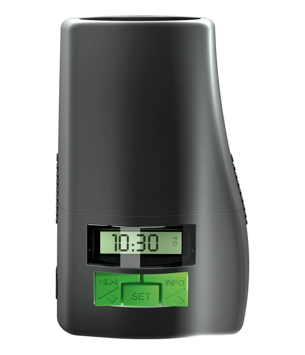 Für alle Aquarianer, die beruflich oder privat oft unterwegs sind, gibt es eine optimale Unterstützung bei der Fütterung ihrer Fische: der Tetra myFeeder Futterautomat lässt keine Wünsche offen. Mit digitalem Display, Ladestandsanzeige der Batterien und Füllstandsanzeige über ein Sichtfenster ist die automatische Fütterung Ihrer Fische ein Kinderspiel. Und das einzigartige Doppelgehäuse-System schützt das Fischfutter zuverlässig vor Feuchtigkeit, Luft und Licht.