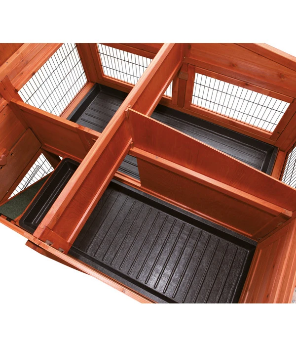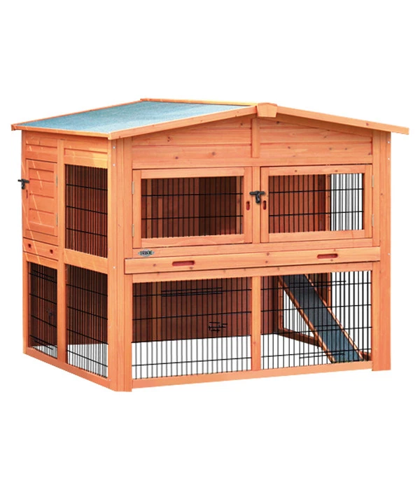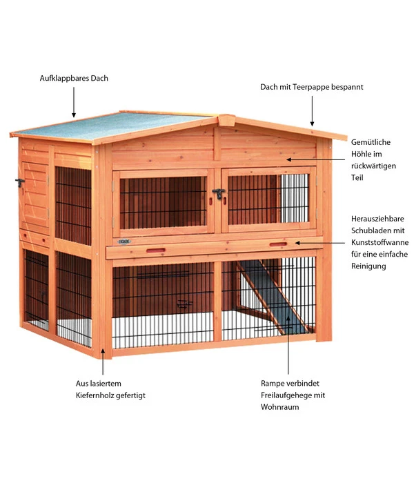 Spielen, Schlafen und Fressen unter einem Dach – für Kaninchen ist das Nagerheim Natura XL von Trixie ein Traum. Der extra große Kaninchenstall bietet ein Freilaufgehege, in dem sich die Tiere auf dem Rasen bewegen können, sowie im rückwärtigen Teil eine gemütliche Schlafhöhle, die für Kaninchen eine wichtige Rückzugsmöglichkeit darstellt. Der herausnehmbare Zwischenboden sorgt für eine komfortable Reinigung. Zur separaten Nutzung von Stall und Gehege ist die Bodenluke verschließbar. Aus lasiertem Kiefernholz hergestellt und auf dem Dach mit Teerpappe bespannt, ist der Kaninchenstall bestens gegen Witterungseinflüsse geschützt.Unter dem Dach befindet sich zudem ein praktischer Stauraum für Tierfutter o.Ä.